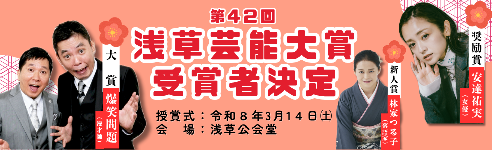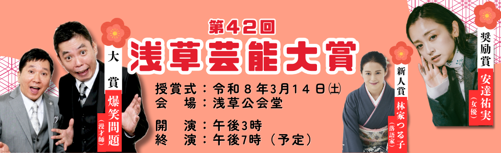 浅草芸能大賞は、大衆芸能の奨励と振興を図ることを目的として、昭和59年4月に創設されたもので、浅草をはじめ東京を中心に活動している芸能人の中から、過去の実績と最近の活動状況を勘案して贈られるものです。