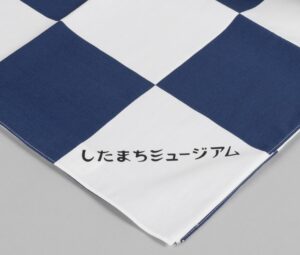 オリジナル風呂敷 日本の伝統文様「市松」と「籠目」を組み合わせ、白地にさわやかな紺色でデザインしました。対角線上に入った当館のロゴがワンポイントです。なんでも包める大判の風呂敷です。 サイズ:90cm×90cm 価格:1500円